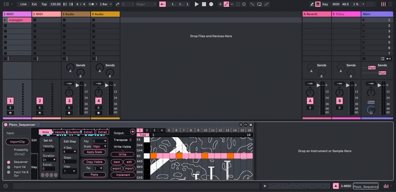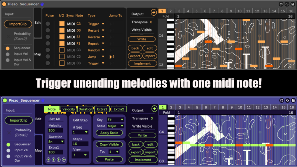 The Piezo Sequencer was made for hands-off performance and with extreme automation in mind. By syncing MIDI notes you can trigger various types of playback on the sequencer. ie banging the same note will progress whatever notes are programed into the sequencer.